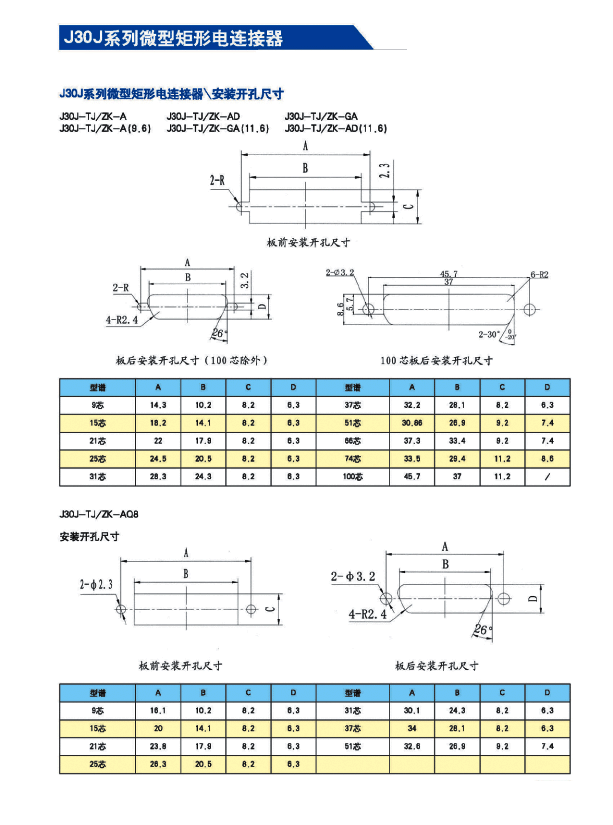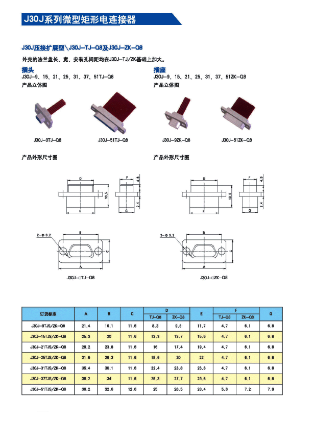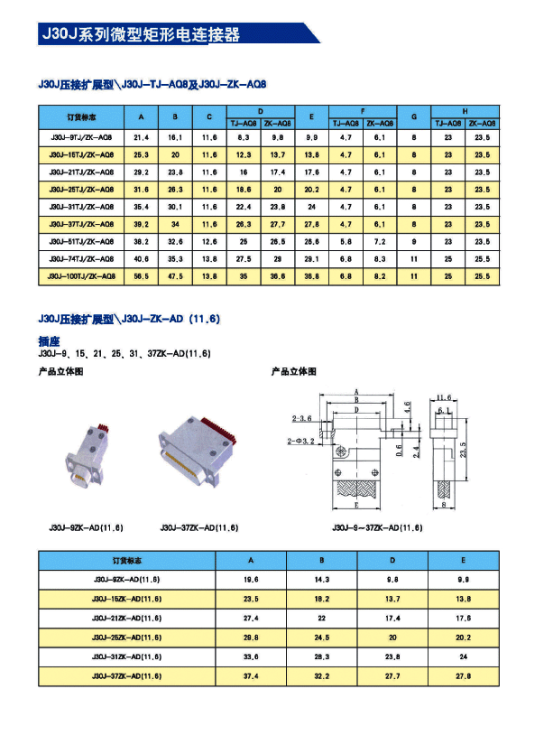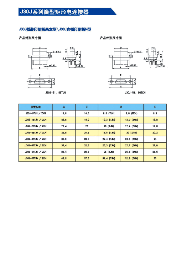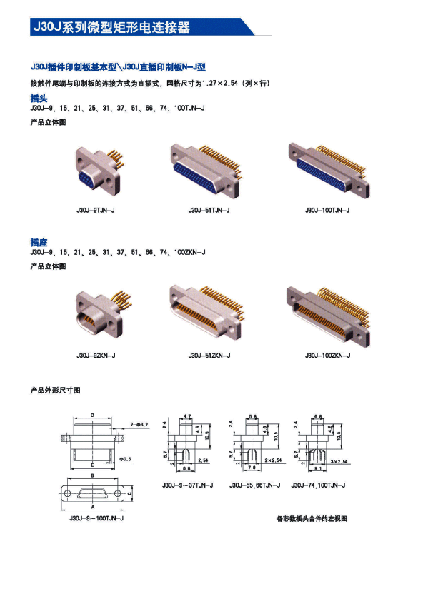 J30J矩形航空插头符合CJB2446;间距1.27mm;产品采用金属外壳;包括9芯-100芯等多种规格;有适用于印制板的尾端变更。